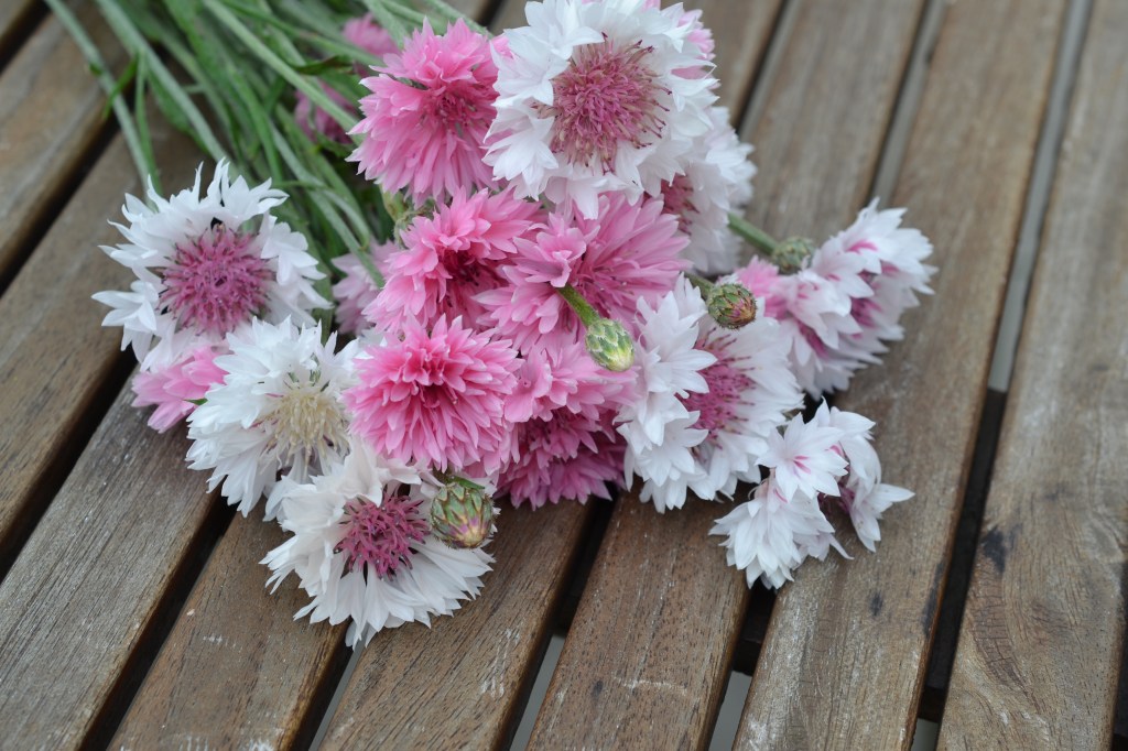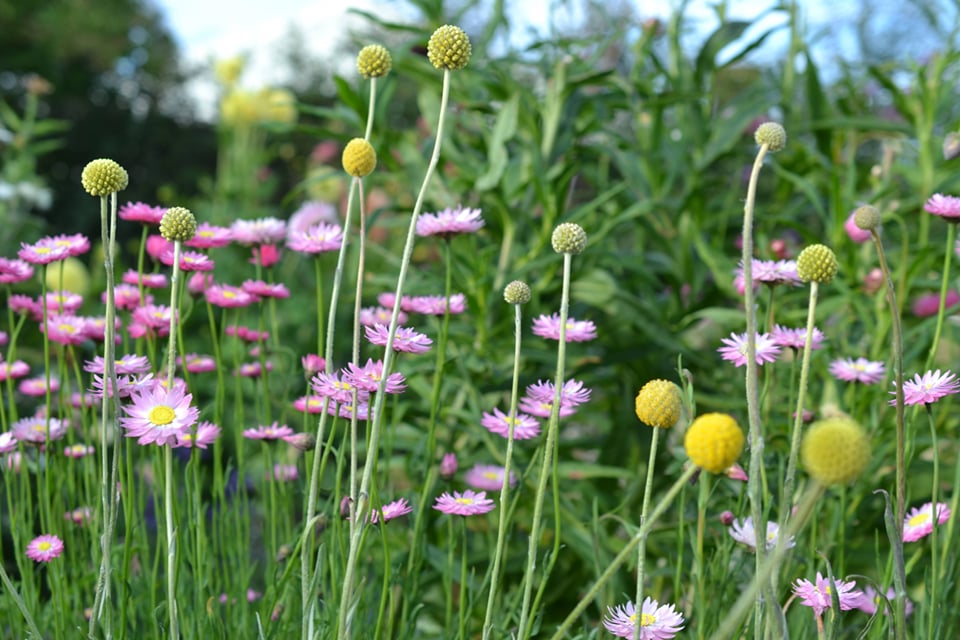 Et af mine højbede har jeg udvalgt til at dyrke forskellige blomster der egner sig til tørring til evighedsbuketter og kranse. Jeg glæder mig til igen at have de sjove runde gule “trommestikker”. I 2021 har jeg ikke haft dem, i det tidlige forår så det ud til at dem jeg havde ville overvintre, derfor såede jeg ikke nye. De overvintrede desværre ikke alligevel og derfor har jeg savnet dem en hel sæson. Af nye spændende sorter jeg glæder mig til at dyrke er Kæmpe Evighedsblomsten ‘ Orange delight’ og Staticen ‘ Apricot desire’. Den sidstnævnte er et miks af skønne abrikos og fersken nuancer. Den lille letdyrkelige Solvinge Helipterum roseum ‘ Pierrot’ skal jeg have igen, de smukke hvide blomster tørres let, men pynter også friske i buketter. I det hele taget bruger jeg alle disse skønne blomster både friske og tørrede i mine buketter.