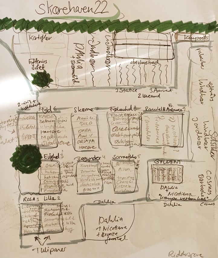 Der bliver et rosa bed, et lilla bed, et bed med evighedsblomster, et bed med gode fyldplanter, et bed med skærmplanter, et bed med gode begynderblomster, et bed med Frøkenhat, et bed med sommerfloks, et gyldent bed og et bed som fortrinvis er tiltænkt franske anemoner og ranunkler, men som plantes til med sommerblomster når de takker af først på sommeren.
