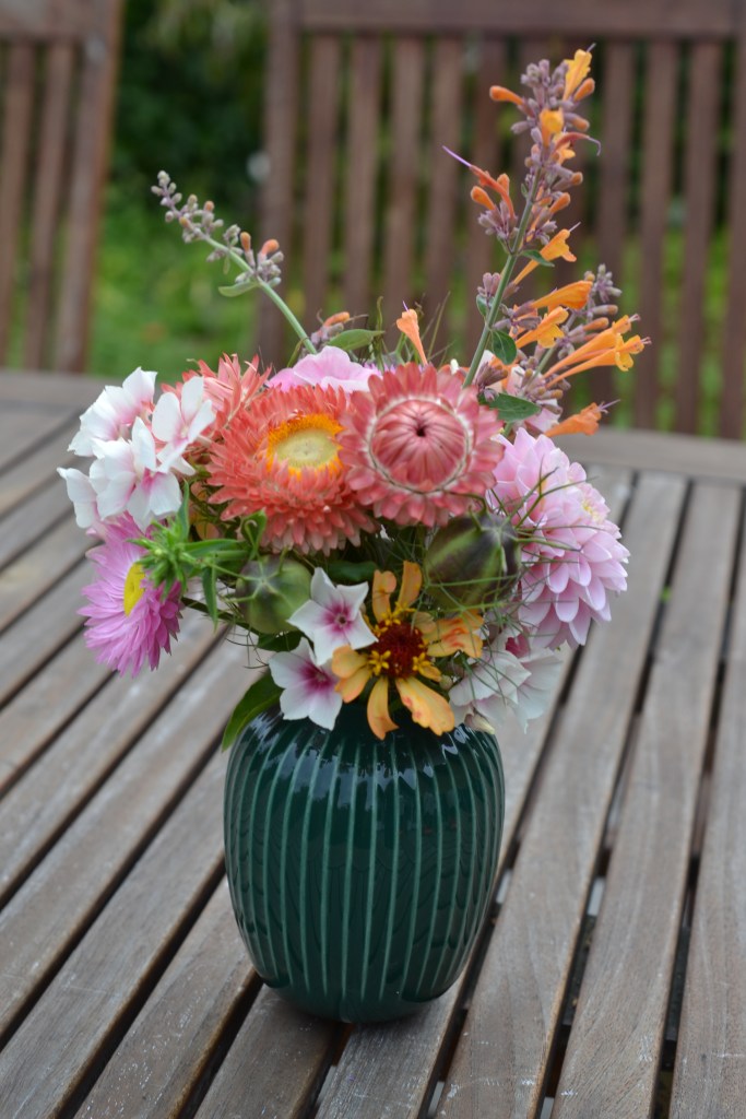 Først et lille tilbageblik på den sæson, som netop er gået. I denne sæson havde jeg lyst til at eksperimentere med at så og plante mere i dekorative helheder, ikke kun på rækker men også i grupper med blandede planter. Målet var at gøre skærehaven endnu smukkere at se på. Helt ærligt var det vandvittigt smukt, men det gav mere arbejde. Der skulle håndluges imellem planterne, ligesom det blev sværere at plukke blomsterne, end når de står samlet på fine rækker; man har simpelthen ikke det samme overblik over hvor der er plukkeklar blomster, når de står hist og pist. Noget fungerede rigtig godt, andet knapt så godt. Noget der virkelig blev fint var de smukke kanter af lave florlette blomster og græsser, som jeg såede langs mine to store Dahliabede forrest i skærehaven. De blev simpelthen så flotte – du finder “opskriften” på dem lige her hvis du selv har lyst til at dyrke dem.
