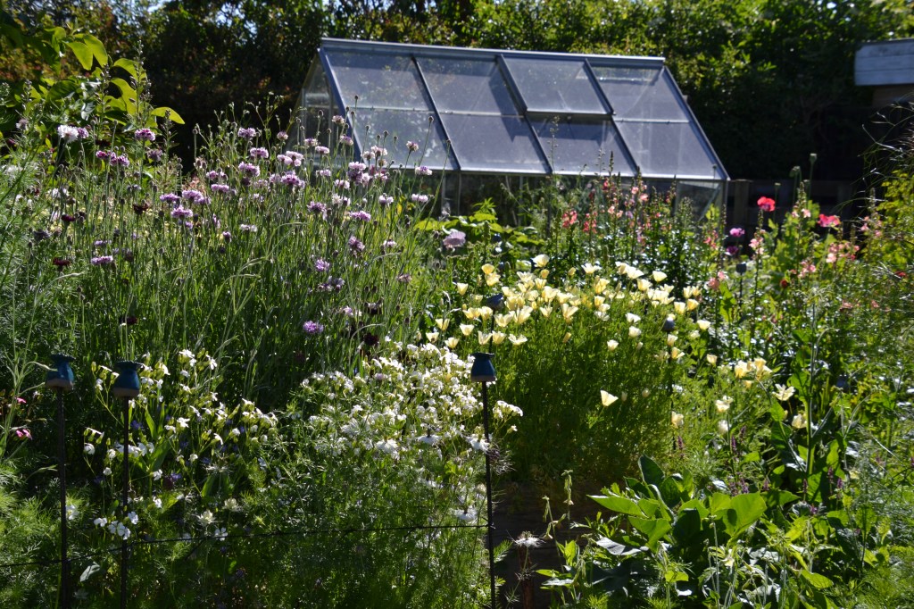 Når jeg dyrker så mange forskellige blomster på et lille areal kan det hurtigt blive spraglet at se på. I denne sæson havde jeg derfor besluttet mig for at farverne var det vigtigste princip for hvordan planterne blev placeret. Planen var et gradvist farveskift fra pastel i skærehavens ene hjørne til varme stærke farver i det modsatte hjørne. Det princip lykkedes i nogen grad, selvom lidt selvsåede blomster hist og pist dukkede op som farverige klatter, midt i alt det farvekoordinerede. Der var også enkelte blomster, som havde en mere kraftig farve end jeg havde forventet, men alt i alt gik det godt. Jeg har planer om at gentage denne måde at farve-planlægge skærehaven i den kommende sæson. Så jeg har de lyse pastelfarver nærmest shelteren og de mere varme og kraftige farver tættest på hækken ind i mod naboen. Når min skærehave er så lille (små 100 m2) og jeg ønsker at dyrke så meget forskelligt, kan lidt “farvelade” dog ikke helt undgås.