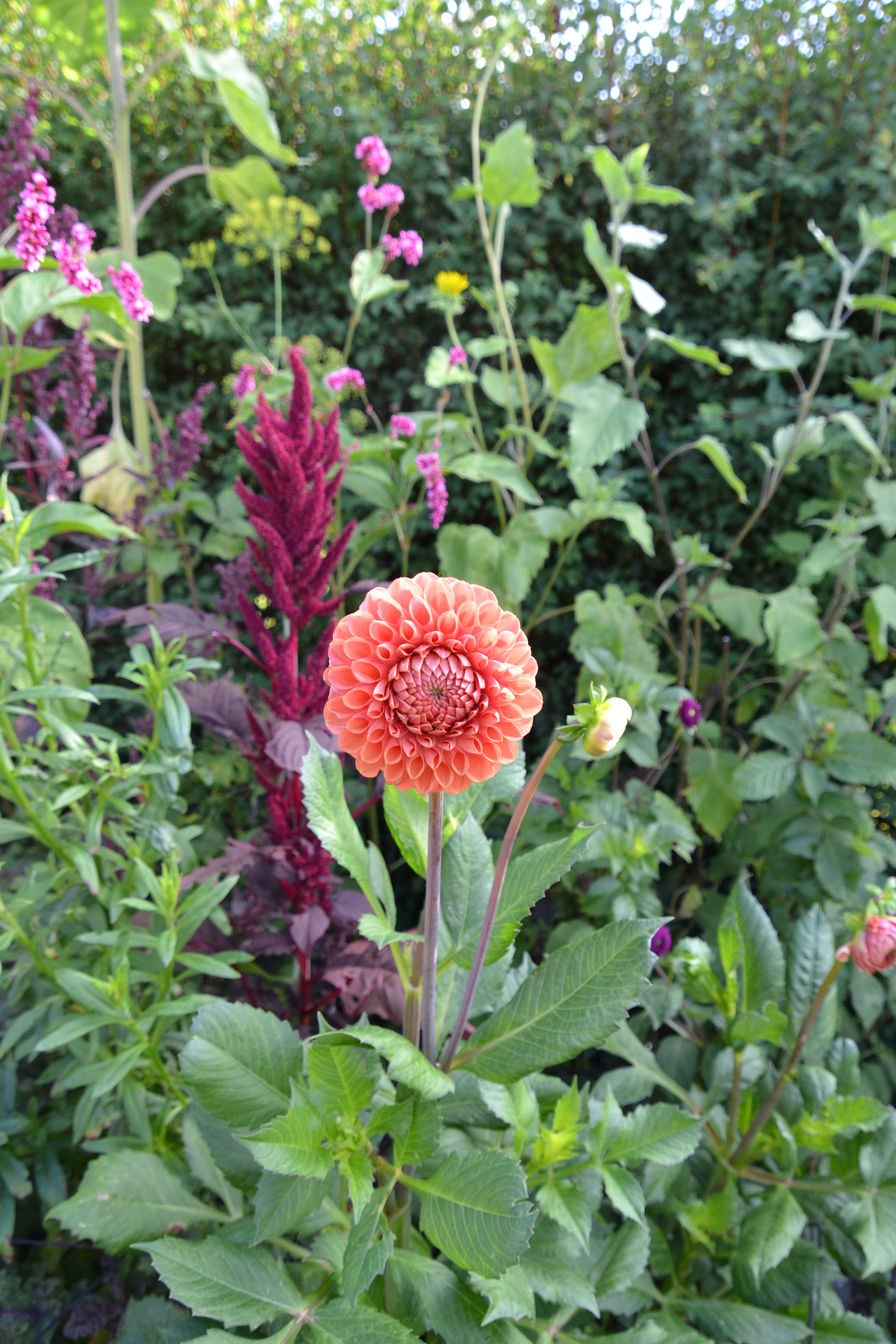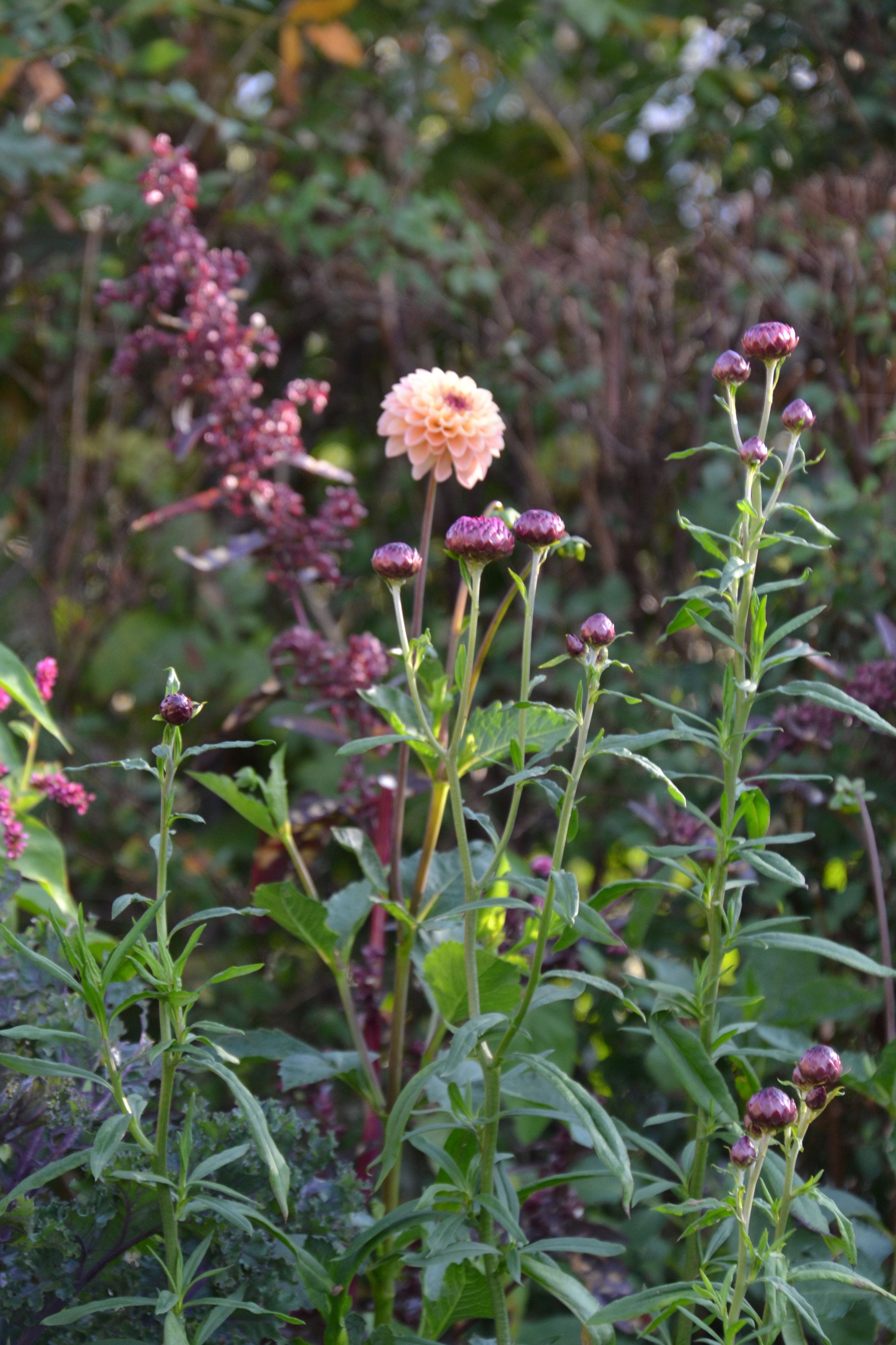 I det største jordbed, det der engang var køkkenhave, skal der være plads til alle de mest farverige Dahlia. Det er mest lilla og orange Dahlia jeg har her. De skal dyrkes sammen med de smukke gule skærme fra skærmdild og de iøjnefaldende blomster hos Persicaria orientalis, som også kendes under det romantiske navn “Kiss me over the garden gate”. Måske sår jeg også lidt røde amarant og rød havemælde og planter ind imellem det hele. Ligesom jeg håber at de smukke rudbeckia triloba overlever og bidrager til farveorgiet. Det bliver nærmest en gentagelse af det jeg havde i år, men det var også bare fantastisk, så hvorfor ikke gøre det igen.