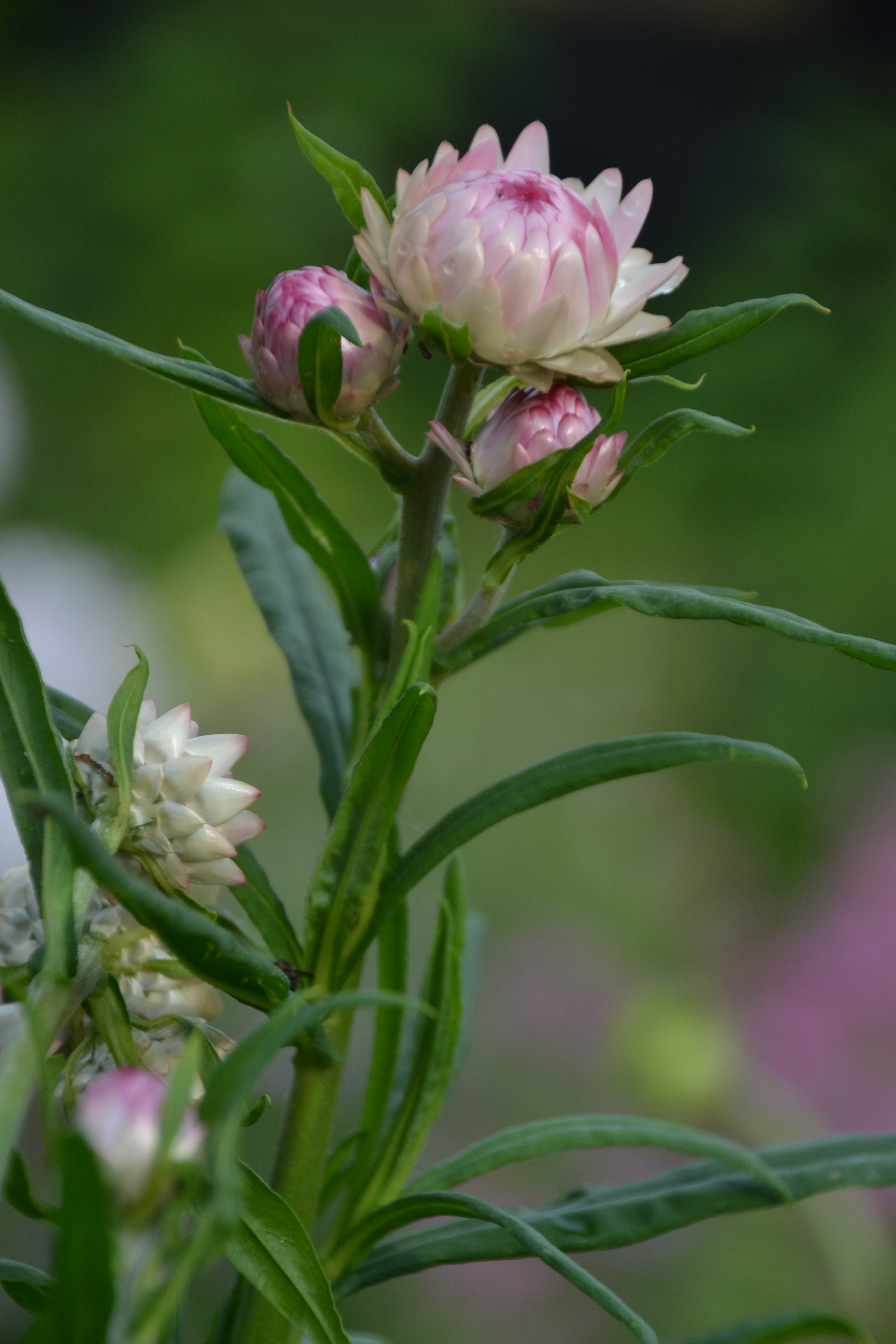 Den enårige brudeslør er simpelthen så yndig at jeg dyrker den år efter år. Den har ikke den længste sæson, så den kan ofte kun plukkes i juni og lidt ind i juli, men jeg synes den er så smuk i buketter, at den får lov til at være i haven hvert år. Den er super let at dyrke, den sås direkte i havens bede i april, når jorden er lun. Kæmpe evighedsblomst af sorten ‘Silvery Rose’ er en af de yndigste evighedsblomster jeg kender, dens farve er sådan helt lys rosa med et lidt sølvagtigt skær, den dyrker jeg helst hvert år, da den både er smuk frisk og tørret. Placeringen tæt på kanten af bedet er fordi jeg i år oplevede at de evighedsblomster der fik mest plads og luft omkring sig, blomstrede bedre og længere, end dem der stod lidt klemt i midten af et bed. Den Enårige Ridderspore ‘ Fancy Belladonna’ dyrker jeg nu på tredje eller fjerde år, jeg kan virkelig godt lide dens lidt mere spinkle og elegante vækstform og den lille fine hvide detalje i midten af blomsten, den vil jeg gerne have plads til hvert år. Løvemund af sorten ‘Costa Silver’ er den yndigste lyse rosa farve, jeg dyrkede den forrige år og den var virkelig smuk i buketter, dertil kom at jeg kunne plukke af den fra juni til frost, hvilket er en egenskab jeg sætter meget højt her i min skærehave.