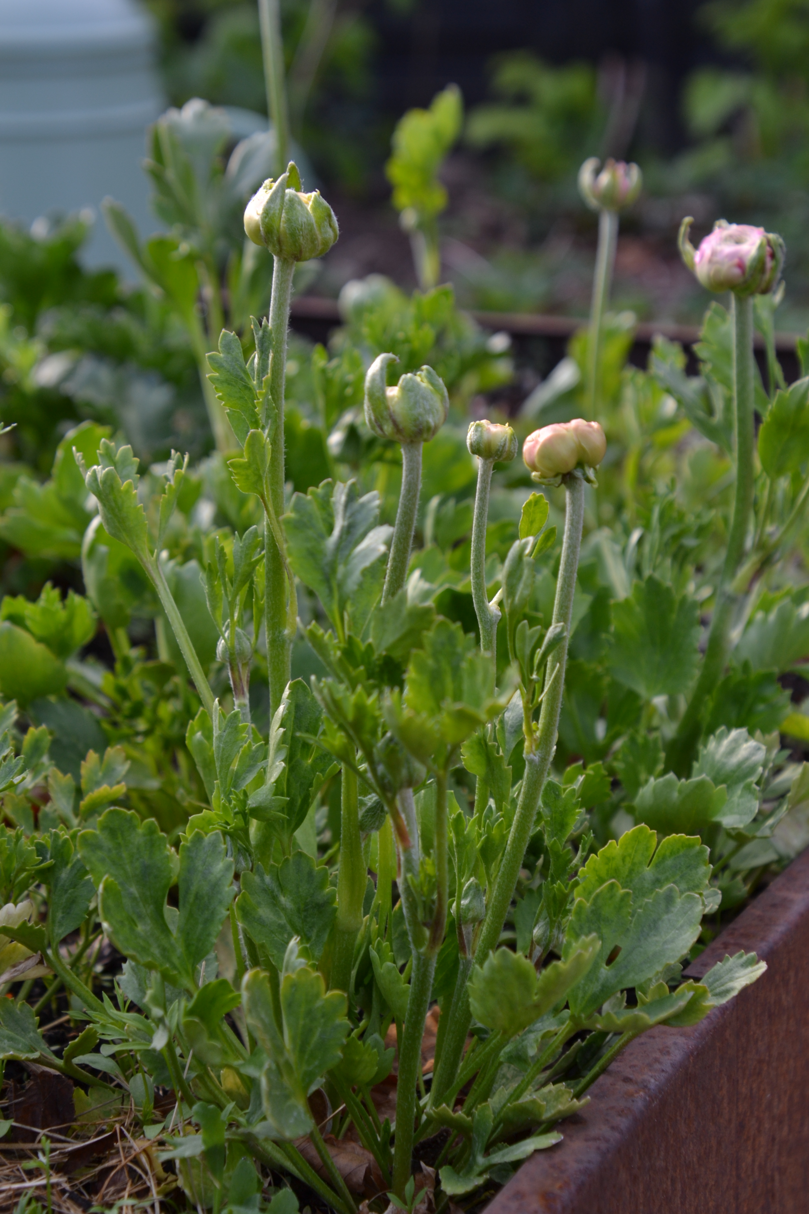 En anden ting jeg dyrkede i to hold, var ranunkler og de små fine agurkebladet solsikke (Helianthus debilis), den kombination er efterhånden en klassiker herhjemme. Fordi de fungerer super godt at kombinere de to ting i samme bed og giver mig blomster fra frost til frost. Jeg forspirer solsikkerne og prikler dem ud imellem ranunklerne. Senere sniger jeg ranunklerne op, helst uden at vælte solsikkerne, det er lidt bøvlet, men det giver mig maximalt udbytte på en ganske lille vokseplads.