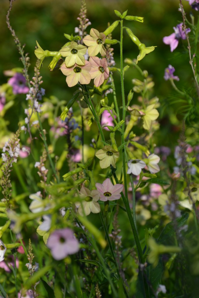 Igen i år havde jeg stor glæde af de mange forskellige smukke prydtobakker jeg dyrker. Det stod smukt i forgrunden af de store dahliabede, plantet ind i et lidt tilfældigt miks. Efterhånden som jeg selv samler frøene, har jeg fået et spændende udvalg af små yndige prydtobakker i forskellige nuancer af hvid, lime, rosa og gammelrosa. Flere af dem ligner afkom af én af mine favoritter, nemlig Nicotiana hybrida ‘Starlight Dancer’, der med yndige små limegrønne og hvide overhængende klokkelignende blomster på tynde stilke er helt vidunderlig, både i haven og i buketter.
