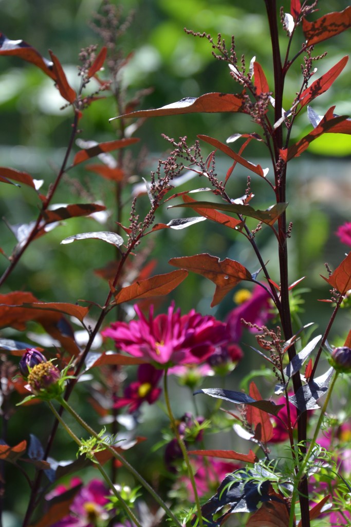 Jeg havde store planer da årets skærehave var på tegnebrættet. Et bed inspireret af den smukke Skønhedsøje, Coreopsis ’ Incredible! Swirl’, hvor cremehvid skulle møde bordeaux i et smukt kontrastfyldt mix. Sådan gik det ikke rigtigt. Skønhedsøje, som havde hovedrollen i dette bed blev ramt at SMUTS og visnede nærmest helt væk inden den begyndte at blomstre, det samme gjorde de smukke Cosmos der skulle have fyldt bedet med de smukkeste cremehvide og bordeaux blomster hele sommeren. Alting væltede rundt imellem hinanden, fordi jeg ikke havde indtænkt opbinding, den græs der skulle have været ’Red jewel’, viste sig at være aldeles grøn osv. Min store drøm blev ikke på nogen måde som jeg havde tænkt. Men altså der var blomster at plukke fra bedet hele sommeren, helheden gik bare aldrig op i… tja en større helhed på noget tidspunkt. Ting blomstrede forskudt, noget blomstrede slet ikke og det hele væltede rundt… sådan kan det også gå, selvom man egentlig burde have erfaring nok til at kunne få det til at lykkes. I haven er da heldigvis altid en chance for at gøre det om næste år.