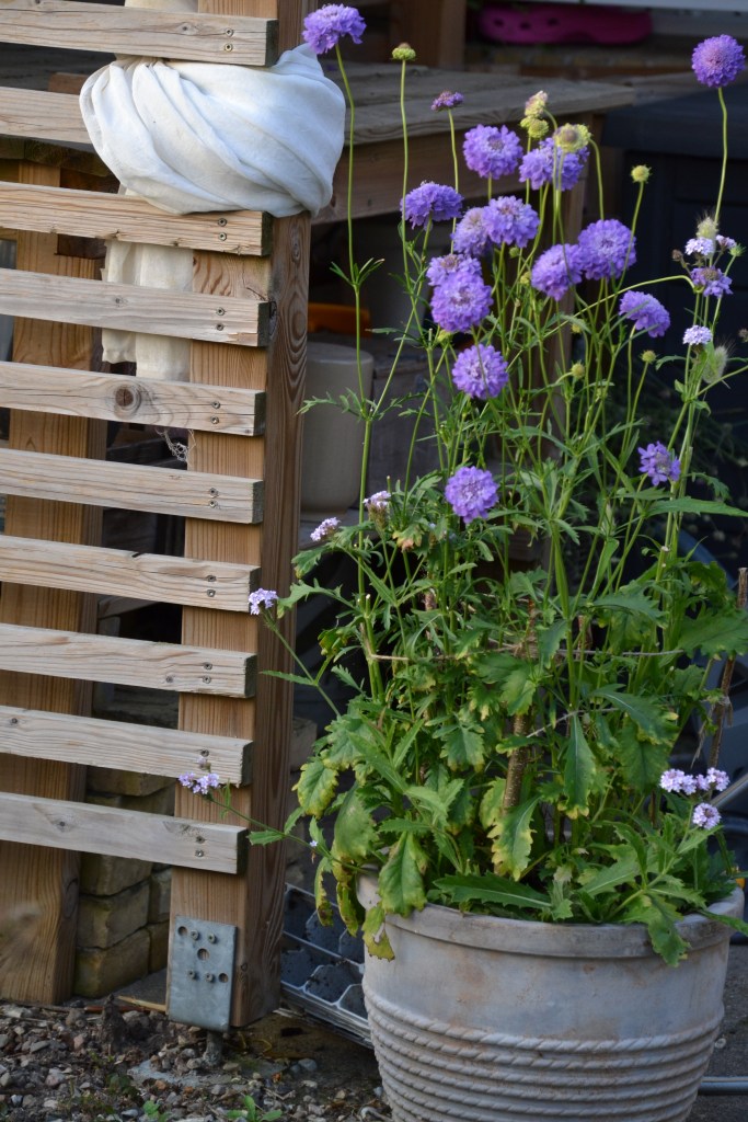 Enkeblomst ’Oxford Blue’ dyrker jeg nok på tiende år, den er bare smuk, længeblomstrende, elsket af sommerfugle, fantastisk i både haven og bukketter – jeg kunne blive ved. I år lavede jeg en stor krukke, hvor jeg plantede Enkeblomst sammen med violjernurt – det var et fantastisk makkerpar, krukken strålede hele sommeren og indtil årets første frost. Sommerfugle og bier flokkedes om den så det var en fryd at se på.