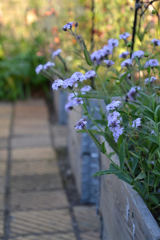 Jeg dyrkede for første gang Violjernurt, Verbena rigida ’Polaris’. Jeg forelskede mig i den for årtier siden, en dag jeg var på ekskursion til landbohøjskolens sommerblomsthave på Frederiksberg, hvor jeg første gang så den lille yndige lyslilla verbena. I år var første år hvor jeg både lykkedes med at skaffe frø og få dem til at spire. Egentlig havde jeg forventet at den med sin lave højde ville blive svær at bruge i buketter, men den kom til at indgå i ganske mange buketter især i sensommeren, hvor den bare blev ved og ved med at blomstre.
