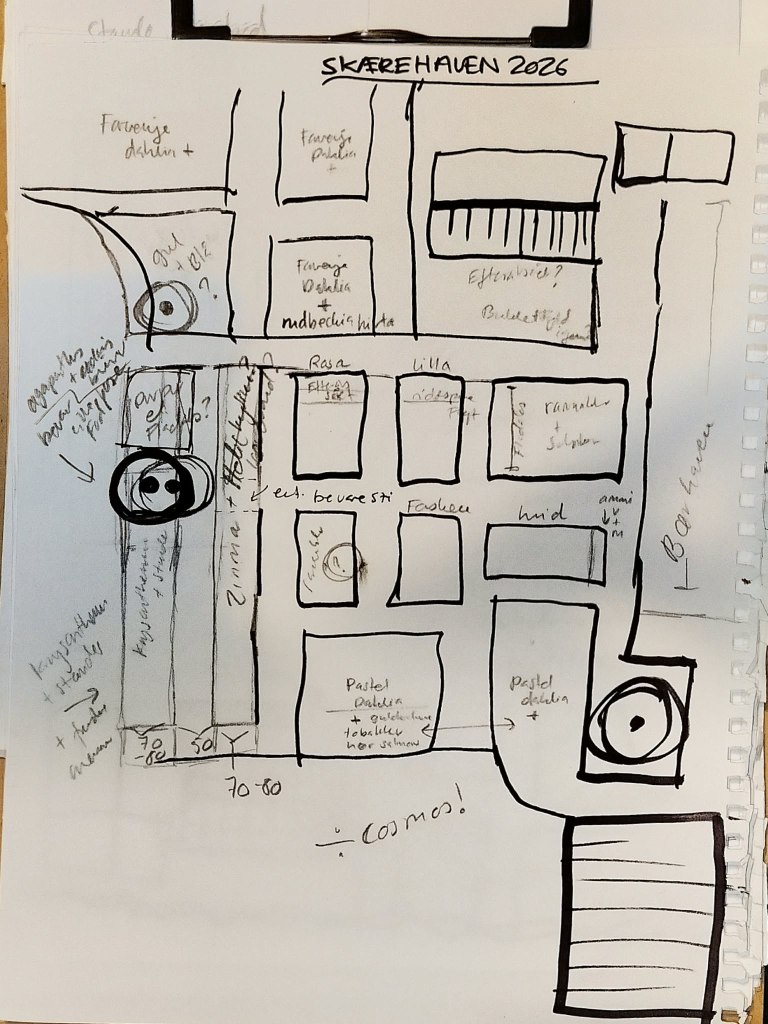 I skærehaven dyrker jeg primært sommerblomster og sommerblomsterende knolde som Dahlia, Ranunkler og Franske anemoner – de fleste stauder har jeg andre steder i haven, i store blandede staudebede. Lidt stauder har der efterhånden sneget sig ind i selve skærehaven, det er dem jeg bruger oftest til snit, eller som har brug for lidt mere pasning for at trives. Herunder en lille hurtigt skitse, som egentlig mest er lavet for mit eget overbliks skyld, jeg håber alligevel, den kan give et billede af hvordan haven er opdelt.