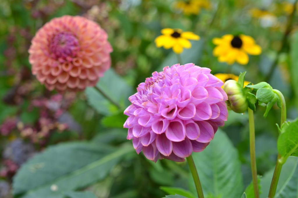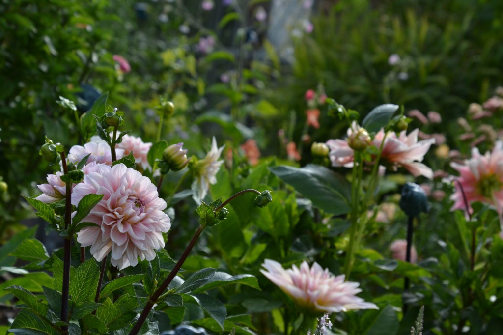 I mine Dahliabede blander jeg sommerblomster og Dahlia. Jeg fordeler Dahliaerne således at de pastelfarvede er i de to store bede ved shelteren og de pangfarve i skærehavens modsatte hjørne. Jeg vælger selskabsplanter i samme farveskala som Dahlia.